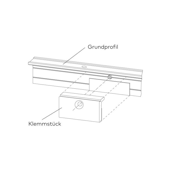 inkl. Grundprofil gebohrt, Schrauben, Klemmstück, Zwischenlagen, 2 x Deckprofil zum Aufclipsen. Endkappen bitte separat bestellen